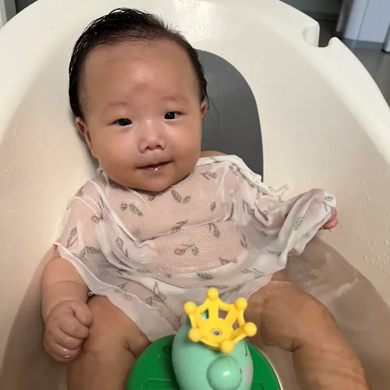 5. 아기를 욕조에 넣을 때는 앉은 자세로 다리, 엉덩이 순서대로 천천히 넣어줍니다 아기를 누인 자세로 물에 넣으면 아기는 불안해할 수 있으니 꼭 앉은 자세로 물에 넣어주고 한 손으로 목을 받치고 척응할 시간을 두면서 천천히 물속에 담가줍니다 물수건을 아기 가슴에 얹어 보온을 유지해주며 세정제를 묻힌 가제 수건과 엄마의 손바닥과 손가락으로 아기의 몸을 살살 닦아줍니다