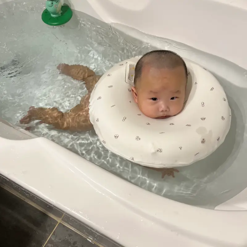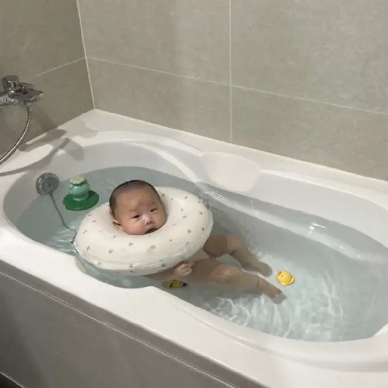 3. 신생아나 6개월 이하의 경우 13cm 또는 아기가 몸을 물에 담갔을때 어깨 정도의 높이까지 올라오게 물을 채워줍니다 6개월 이상의 아기라면 앉은 자세에서 허리 높이 정도로만 물을 채워줍니다