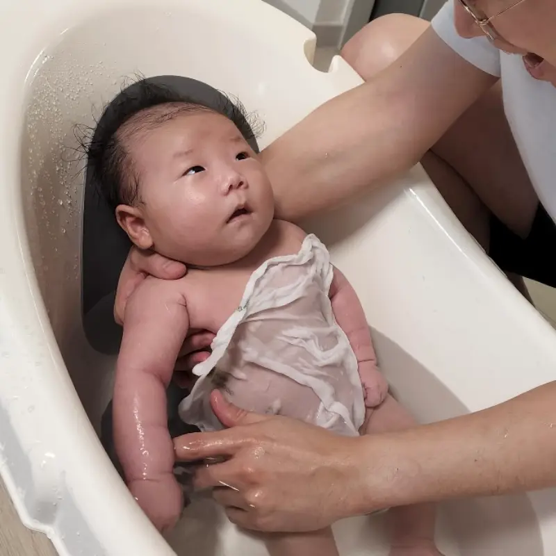 5. 아기를 욕조에 넣을 때는 앉은 자세로 다리, 엉덩이 순서대로 천천히 넣어줍니다 아기를 누인 자세로 물에 넣으면 아기는 불안해할 수 있으니 꼭 앉은 자세로 물에 넣어주고 한 손으로 목을 받치고 척응할 시간을 두면서 천천히 물속에 담가줍니다 물수건을 아기 가슴에 얹어 보온을 유지해주며 세정제를 묻힌 가제 수건과 엄마의 손바닥과 손가락으로 아기의 몸을 살살 닦아줍니다